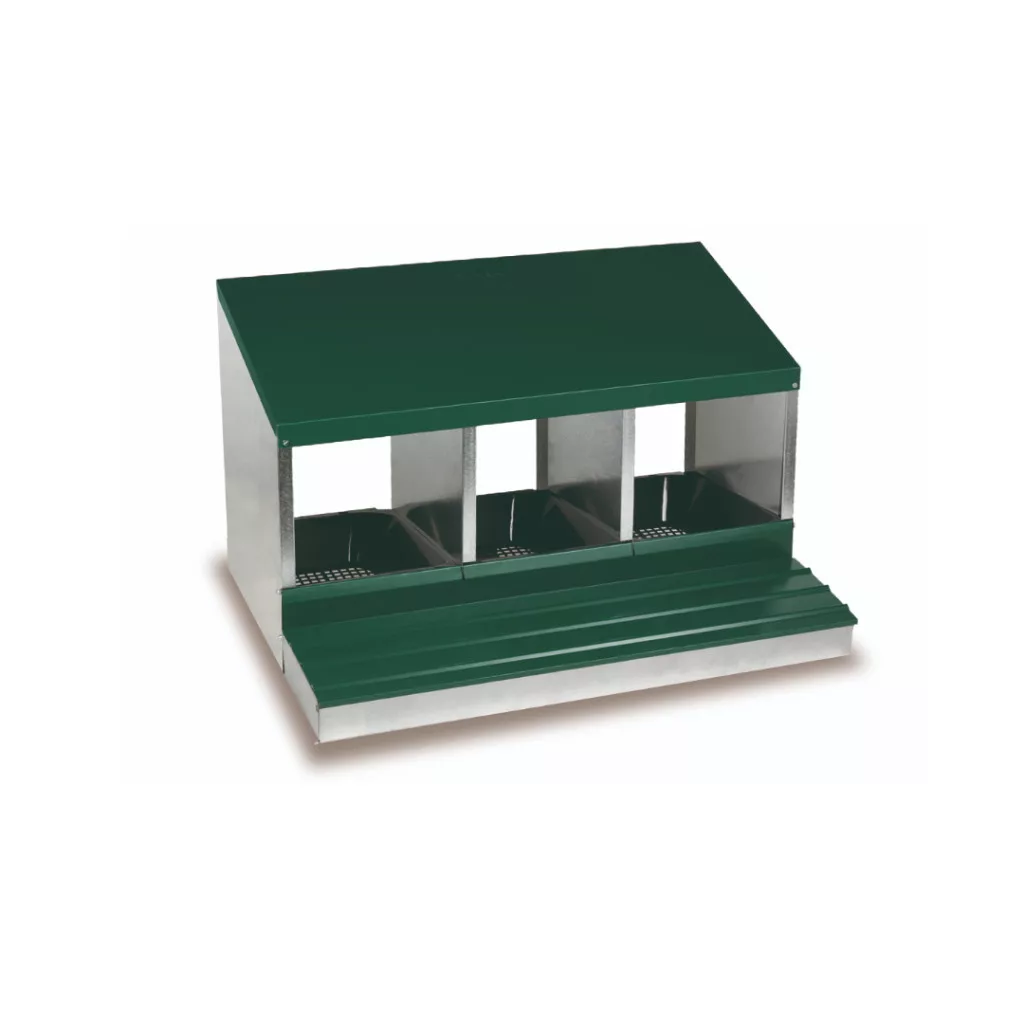 Trojmiestne kovové hniezdo na znášanie pre sliepky s košíkmi na vajcia. Robustné prevedenie a jednoduché čistenie, vhodné pre stredne veľké chovy. Vyrobené z pozinkovaného kovu pre dlhú životnosť a spoľahlivú ochranu vajec pri zbere.