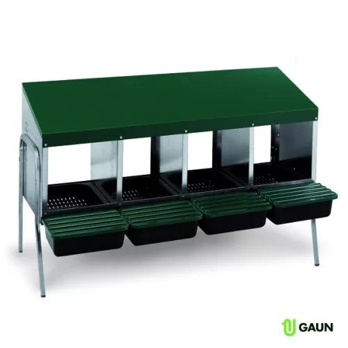 Štvormiestne hniezdo pre nosnice s nohami a plastovým dnom pre sliepky. Jednoduché čistenie, hygienické prevedenie, vyberateľné zásuvky. Kombinácia pozinkovaného kovu a plastu. Ideálne na vonkajší aj vnútorný chov.