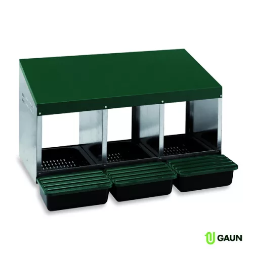 Trojmiestne znáškové hniezdo s plastovým dnom pre sliepky. Pozinkovaný kov, plastové dno, jednoduché čistenie. Možnosť zavesenia na stenu alebo postavenia na podlahu. Ideálne pre chovateľov hydiny. Hygienický a praktický zber vajec v menších chovoch.