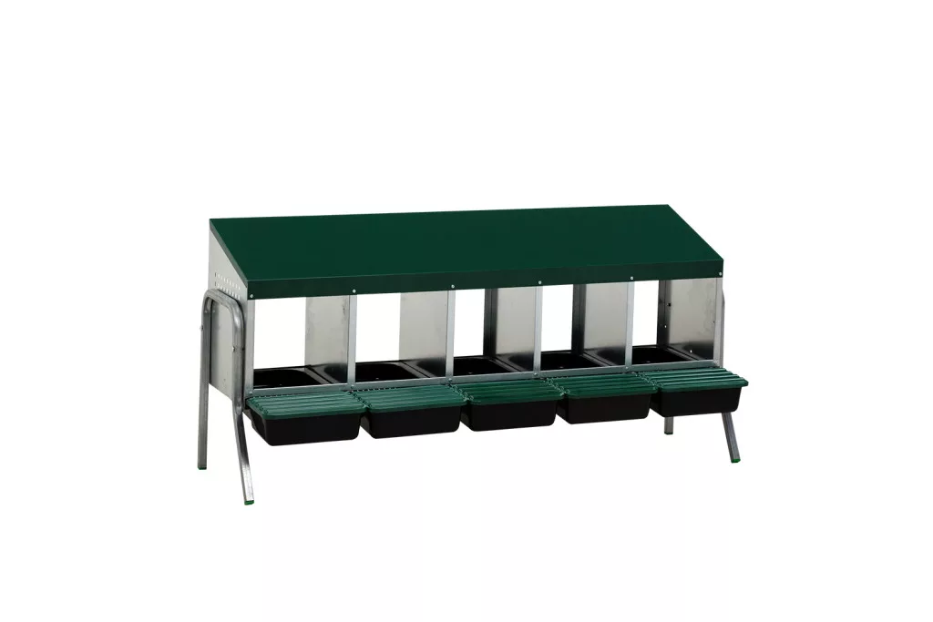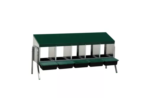 Praktické, 5-miestne hniezdo pre nosnice s plastovým dnom a nohami pre malé a stredne veľké chovy sliepok. Konštrukcia z pozinkovaného kovu je odolná a ľahko sa čistí. Vysúvateľné plastové dno uľahčuje zber vajec aj údržbu. Vyvýšené prevedenie zaručuje pohodlný prístup a lepšiu hygienu v kurníku.