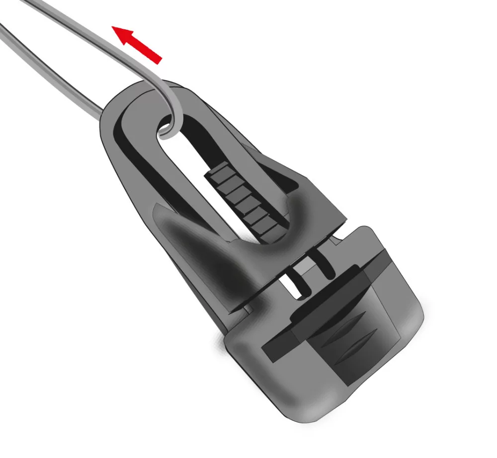2. Nasaďte sponu: priložte na preloženú časť tak, aby zachytila viac vrstiev plachty.
